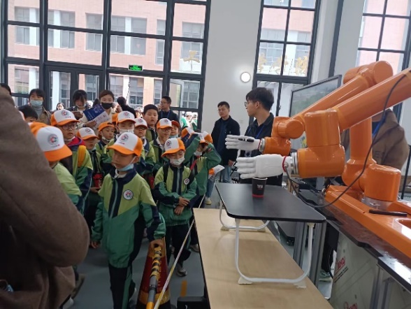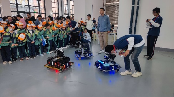 接着参观者来到位于力学二楼101室的工业机器人展示厅,看到的是一些巨大的工业机器人臂在表演。虽然这些机械臂的体型庞大,但它们的灵活度和耐力可远高于人类手臂,能够在高精度的前提下,重复执行同一动作而不会感到疲劳。在展厅中,机械臂展示了令人惊叹的表现,它们可以行云流水般地绘制中科大的校徽、欢迎语,还能够在场地上丝毫不差地完成零部件的精确组装。这些令人惊叹的表现吸引了众多参观者的围观,大人们也纷纷掏出手机进行合影留念。尽管机械臂的体型庞大,但它们展现的精准和高效能力,再次彰显了现代科技在工业领域中的强大应用。