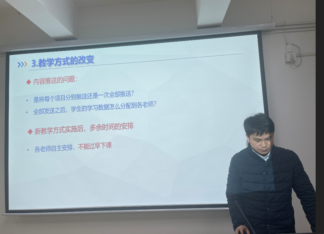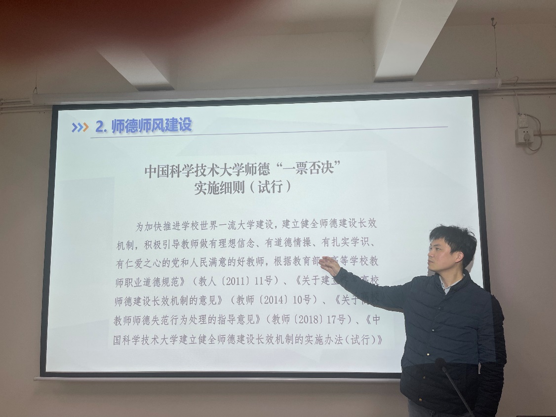 叶老师详细回顾了2023年的教学情况:课程受学生肯定,同时被教育部认定为国家级第二批一流本科课程(线上线下混合式),取得的成绩让人振奋。另外,叶老师还带领大家学习了《中国科学技术大学师德“一票否决”实施细则(试行)》,及《中国科学技术大学教学事故认定及处理办法》等相关文件精神,告诫老师们一定要以高度的责任感和使命感,认真按照学校要求把握好课堂,落实立德树人的任务。