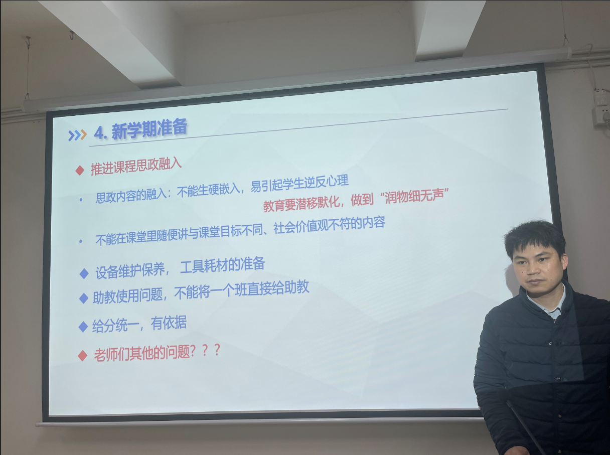 最后一项议程,叶老师布置了新学期的教学任务,提醒课程组教师要及时关注耗材储备量,并在上课前做好仪器设备检修工作。最后,叶老师表示课程思政是专业课程中非常重要的组成部分,希望各授课教师能够根据教授章节内容,深思熟虑,积极探索,恰当融入课程思政内容,实现课程育人。
