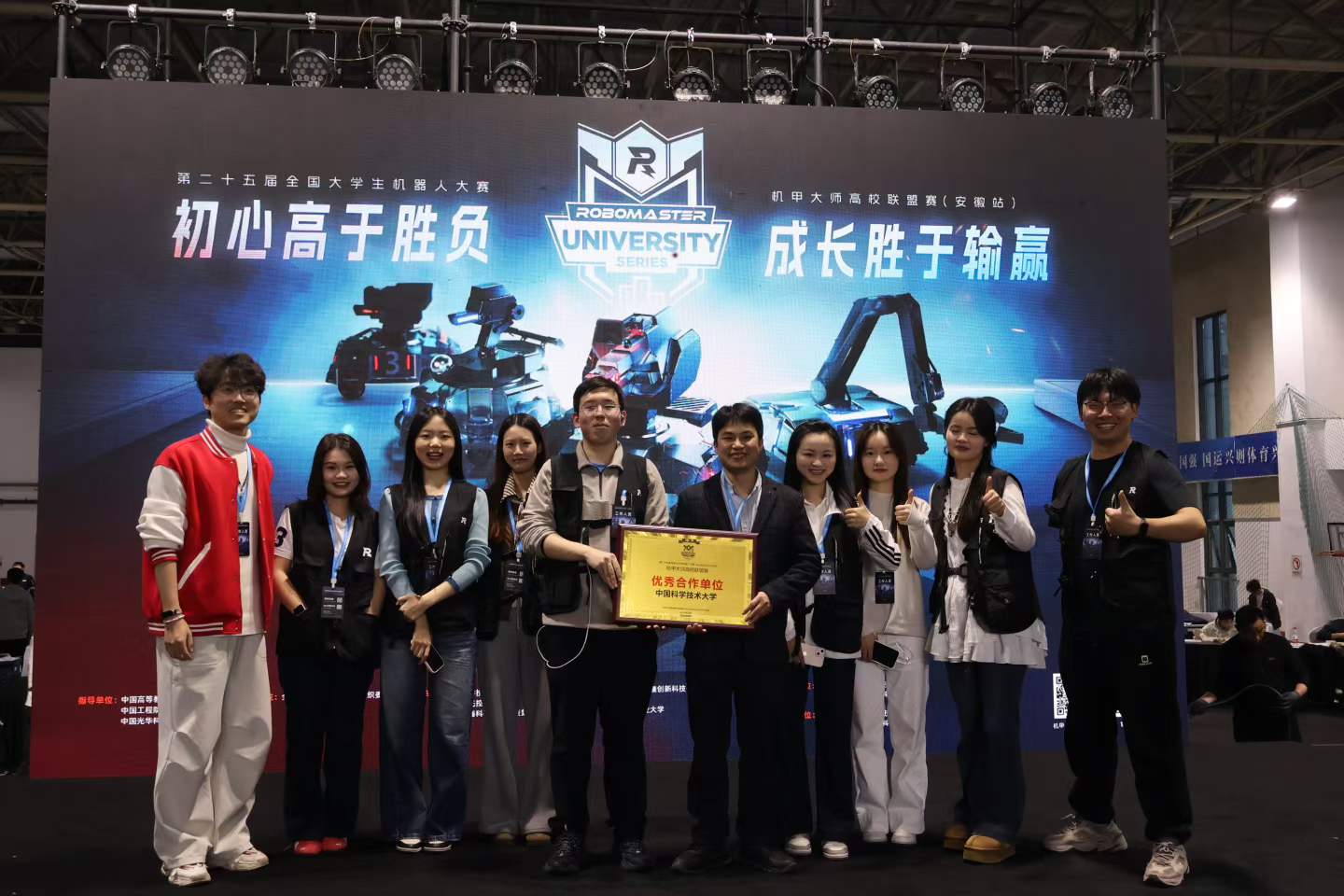 在开幕式的隆重环节中,为表彰各方在科技创新和人才培养方面的贡献,全国大学生机器人大赛RoboMaster 组委会正式授予中国科学技术大学、合肥国先控股有限公司、合肥瑶海科技创新投资集团“优秀合作单位”称号。这一授牌不仅是对中国科大及工程科学学院在产教融合与科技创新教育上的高度认可,也寄托了各方深化协同育人、共筑创新生态的美好期许。
